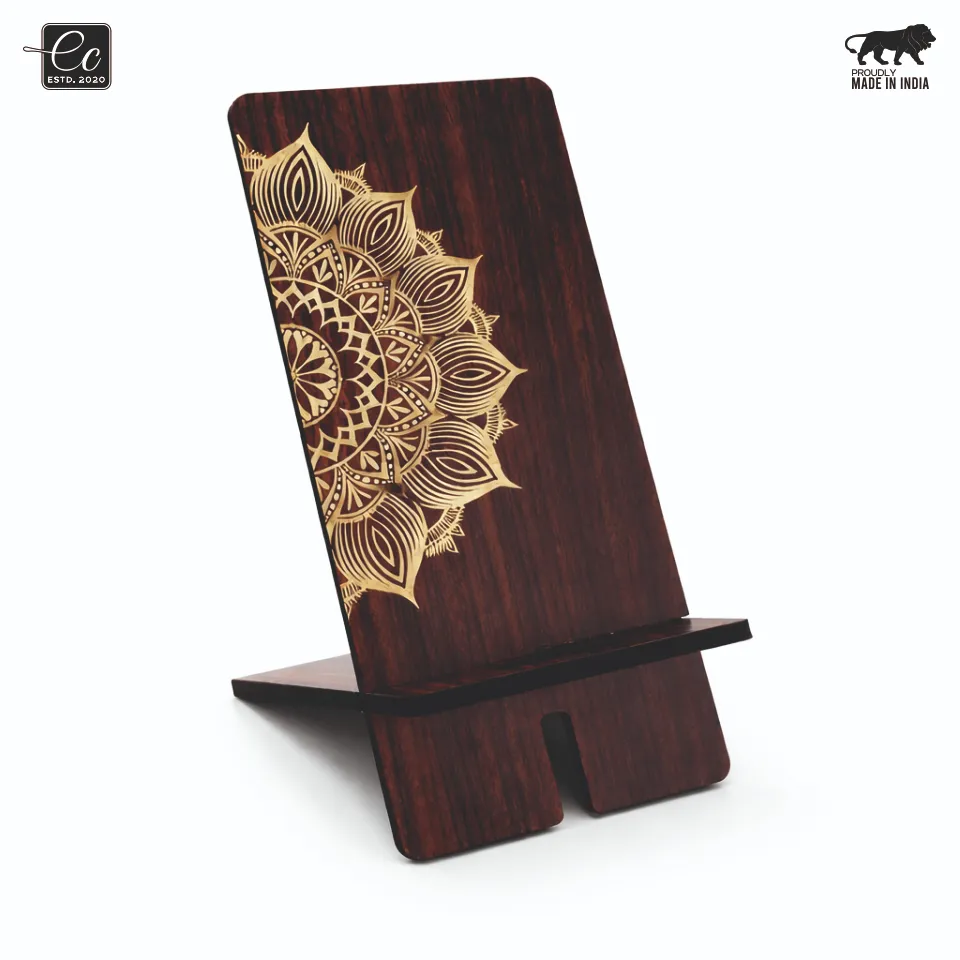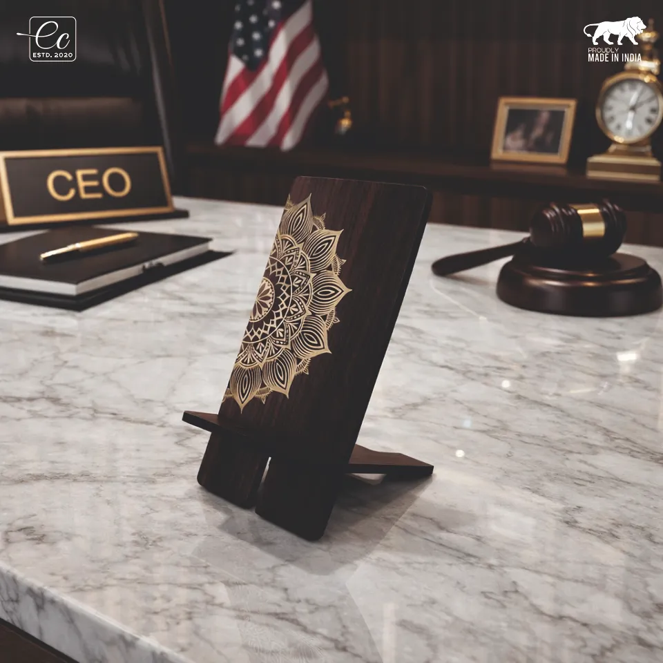 Add a touch of sophistication to your workspace with this exquisitely crafted Premium MDF Wooden Mobile Stand, featuring a finely engraved gold mandala design. Designed for modern professionals, this piece seamlessly blends functionality with luxury aesthetics, making it perfect for executive desks and premium environments.