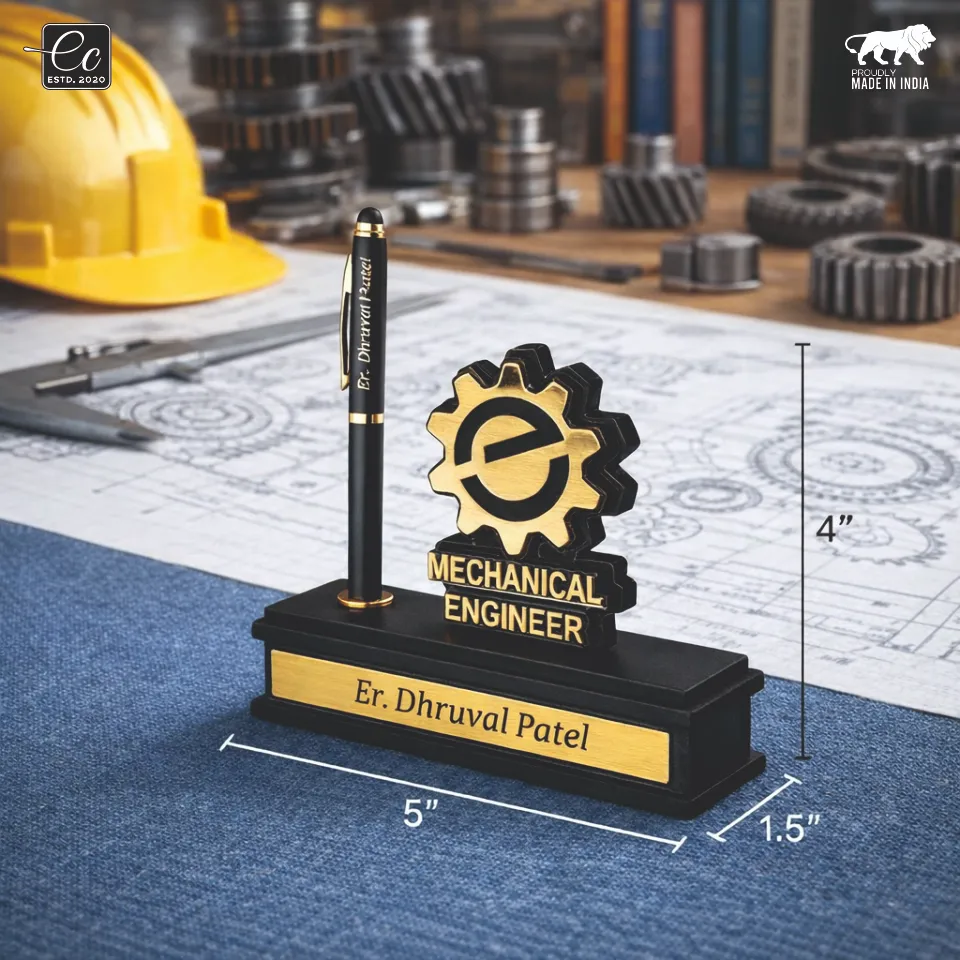 Crafted with a sleek black base and luxurious gold accents, it features a bold Mechanical Engineer emblem, a smooth pen holder, and a custom engraved nameplate—making it a standout piece on any desk.