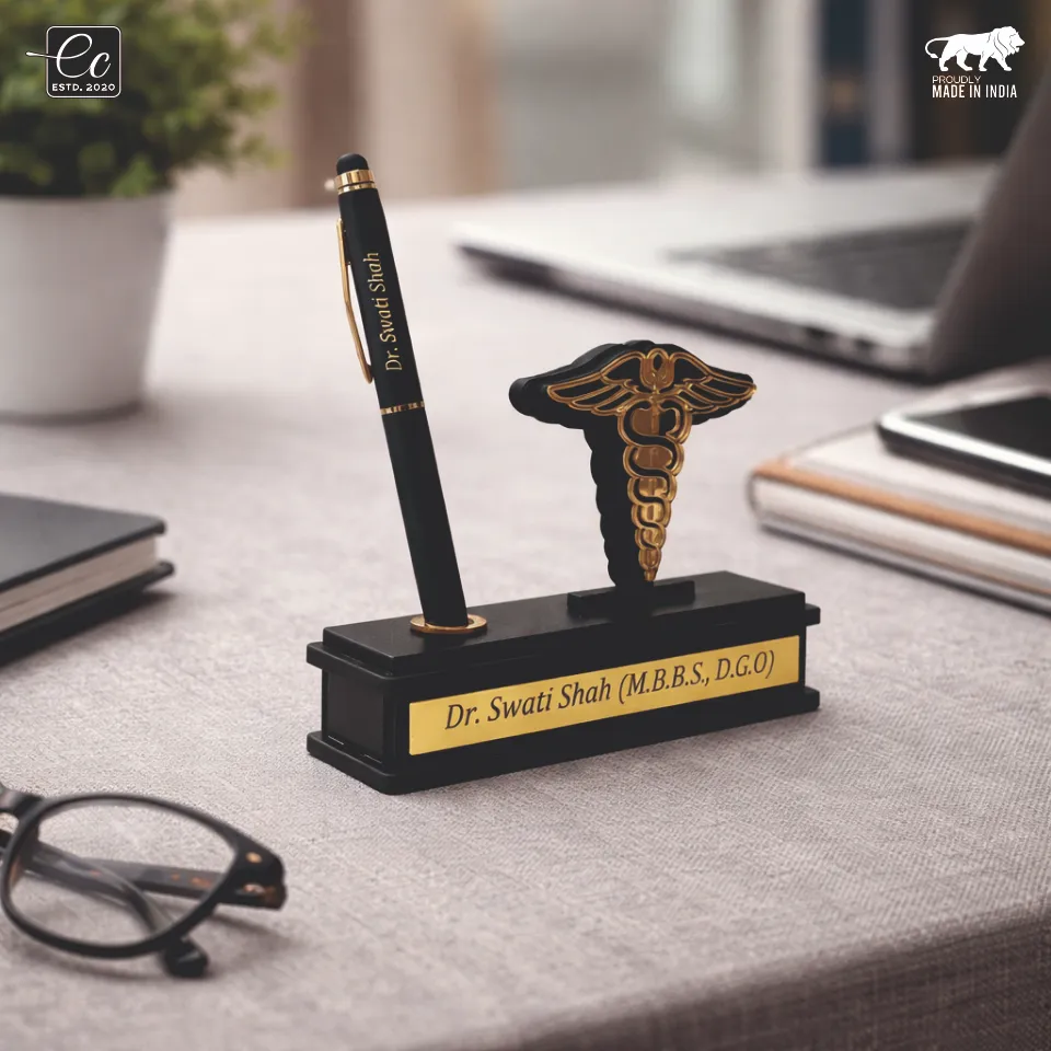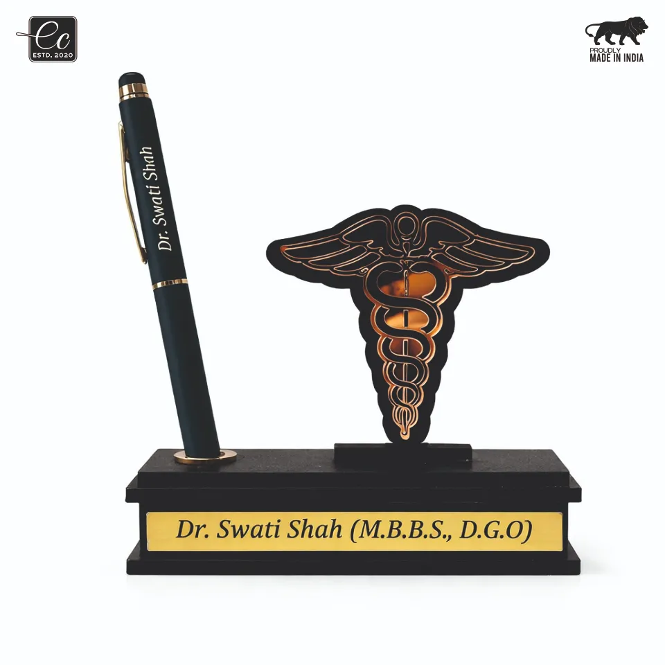 Elevate your workspace with this luxury doctor-themed desk organizer, thoughtfully designed to reflect professionalism, precision, and prestige. Featuring a striking golden medical emblem (Caduceus) and a custom engraved nameplate, this desk accessory adds a refined identity to any doctor’s cabin or clinic desk.