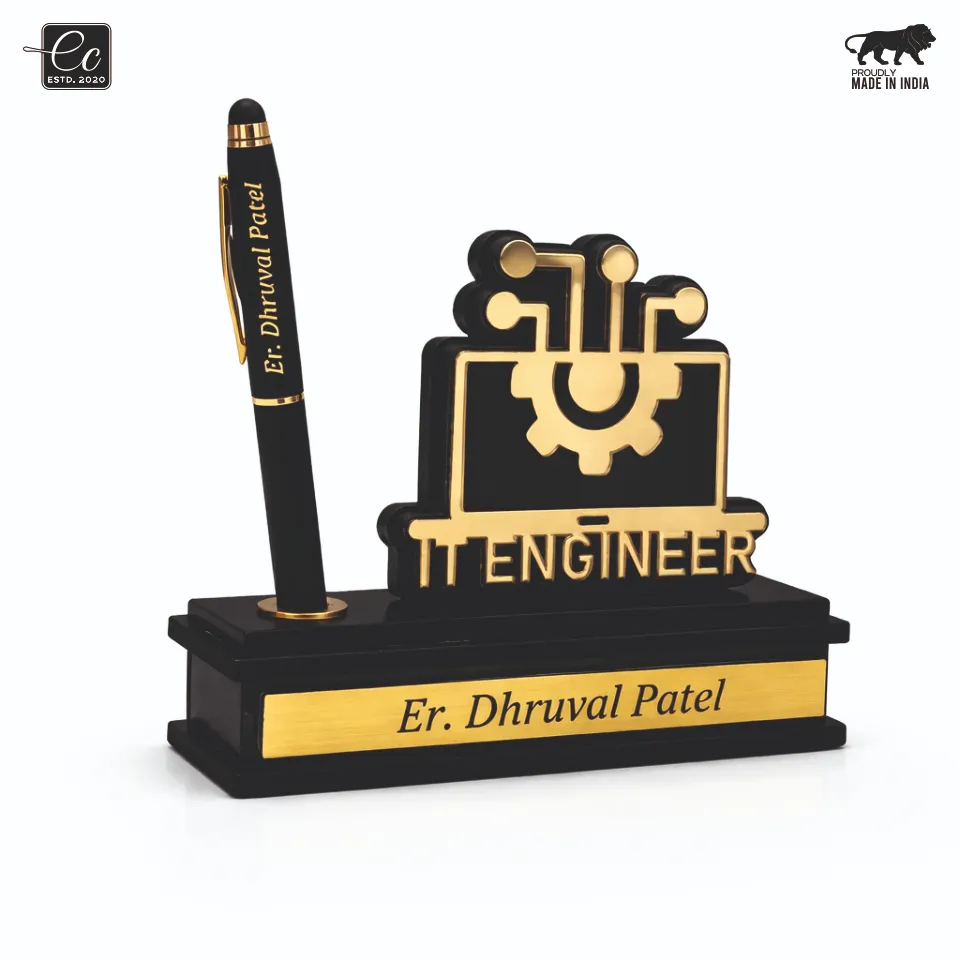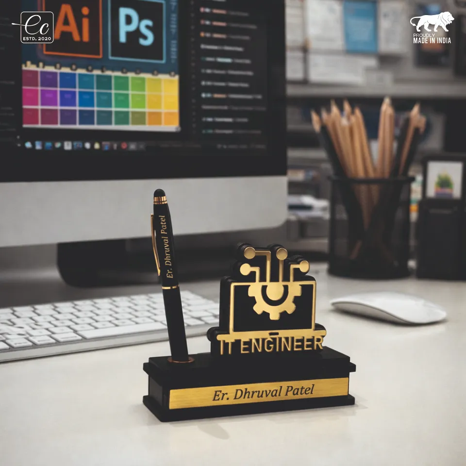 Upgrade your workspace with this stylish and personalized desk organizer, specially designed for IT professionals and creative graphic designers. Featuring a sleek black & gold finish, this premium piece blends technology, creativity, and elegance into one standout desk accessory.