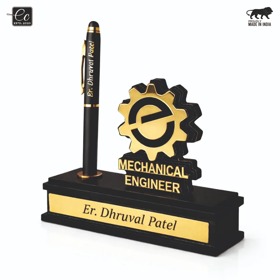 Crafted with a sleek black base and luxurious gold accents, it features a bold Mechanical Engineer emblem, a smooth pen holder, and a custom engraved nameplate—making it a standout piece on any desk.