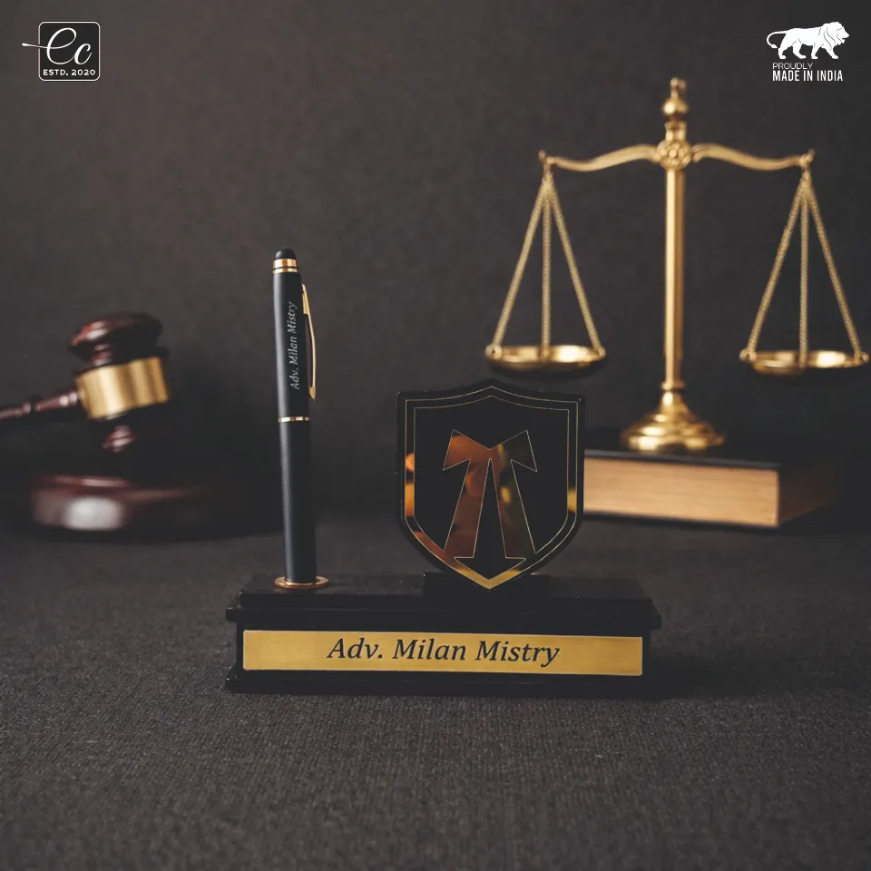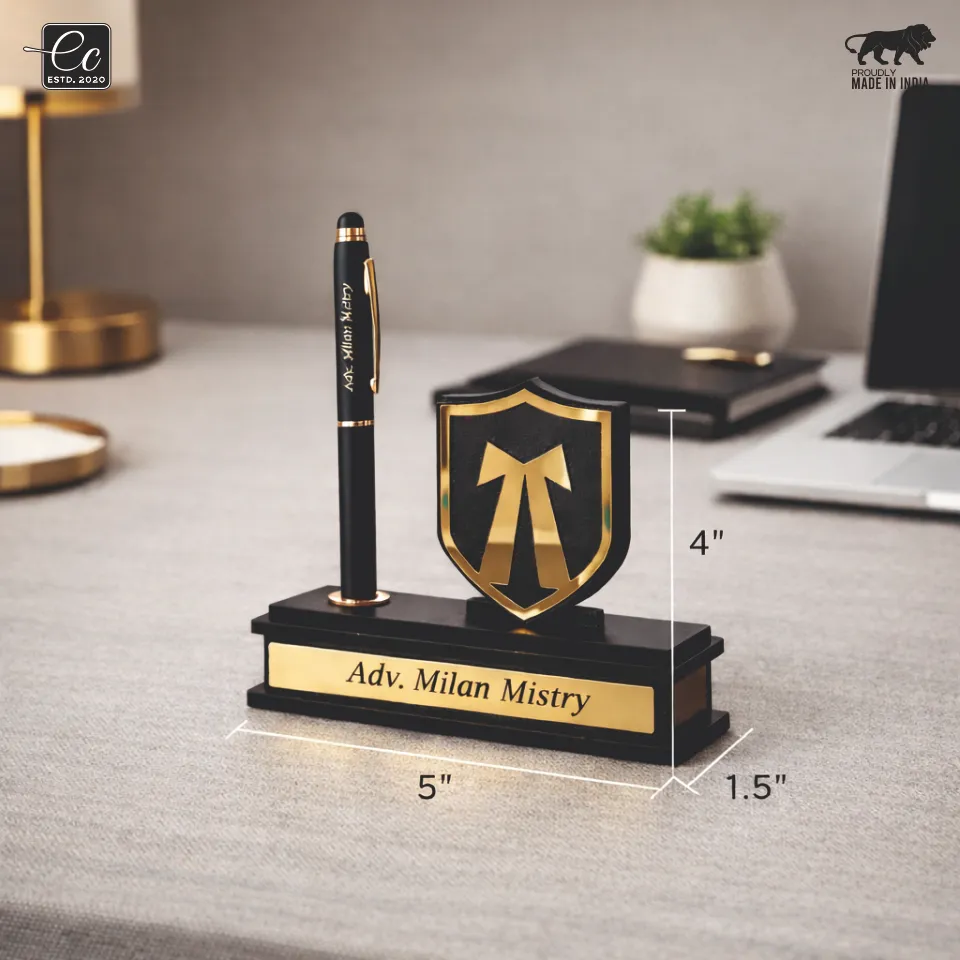 Upgrade your workspace with this elegant and professional desk name plate, designed especially for advocates, legal professionals, and corporate executives. Crafted with a premium black base and luxurious gold detailing, this desk organizer adds a refined and authoritative presence to any office setup.