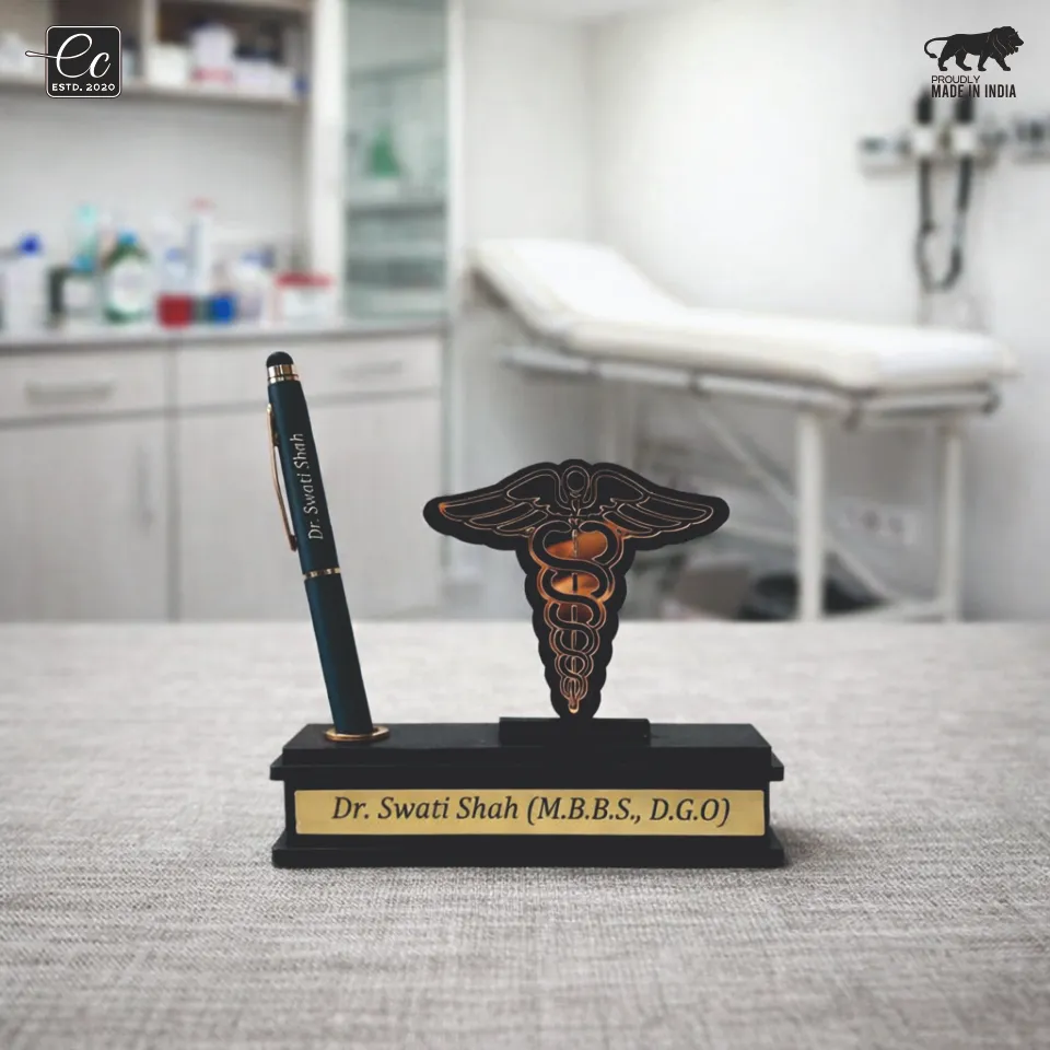 Elevate your workspace with this luxury doctor-themed desk organizer, thoughtfully designed to reflect professionalism, precision, and prestige. Featuring a striking golden medical emblem (Caduceus) and a custom engraved nameplate, this desk accessory adds a refined identity to any doctor’s cabin or clinic desk.